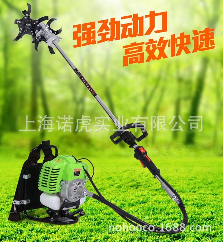 欢迎全国 微商 代理商 经销商 加盟代理 支持一件代发 2022诺虎新型背负式锄草除草机 松土机 翻土机 诺虎根据客户不同需求,独家定制多种套餐,请您仔细选购 【一】两冲程发动机加混合油,90#油、机油按照25:1比率混合兑比使用,劲相对大一点,油耗大,噪音大。 【二】四冲程发动机加纯90#油,90#油、机油分开添加,节能环保省油,低噪音,跟摩托车相同使用原理,诺虎实业推荐款! 温馨提醒:新型小型割草锄地松土割草特点: 松软沙质地(硬土不适合用)、经济作物种植的松土、中耕和除草(草长会绕进 机头里面、一般建议超过10公分左右的草先割一下再使用机器)。 广泛适用于田间耕作,塑料大棚、烟草、苗圃,果园,茶园的管理等锄草种植 作业,具有重量轻,体积小,结构简单,操作方便,易于维修,油耗低,生产 效率高等特点,彻底告别锄头日当午的劳累锄地作业。 诺虎除草机产品三大优势解读: 1)背负式松土除草机整机配置自由搭配:割草头、松土轮、锄草轮自由选, 客户需要哪个功能,就搭配选择哪个功能头。 2)此机还可以加高枝锯、高枝剪等功能头,实现多功能作业需求,其他功能头需要 另外单独自由选择订购。 3)锄草刀-松土刀直径有22公分、27公分、35公分三种,厂家推荐27公分,默认发27公分款,有其他要求,需跟客服联系确认!!!