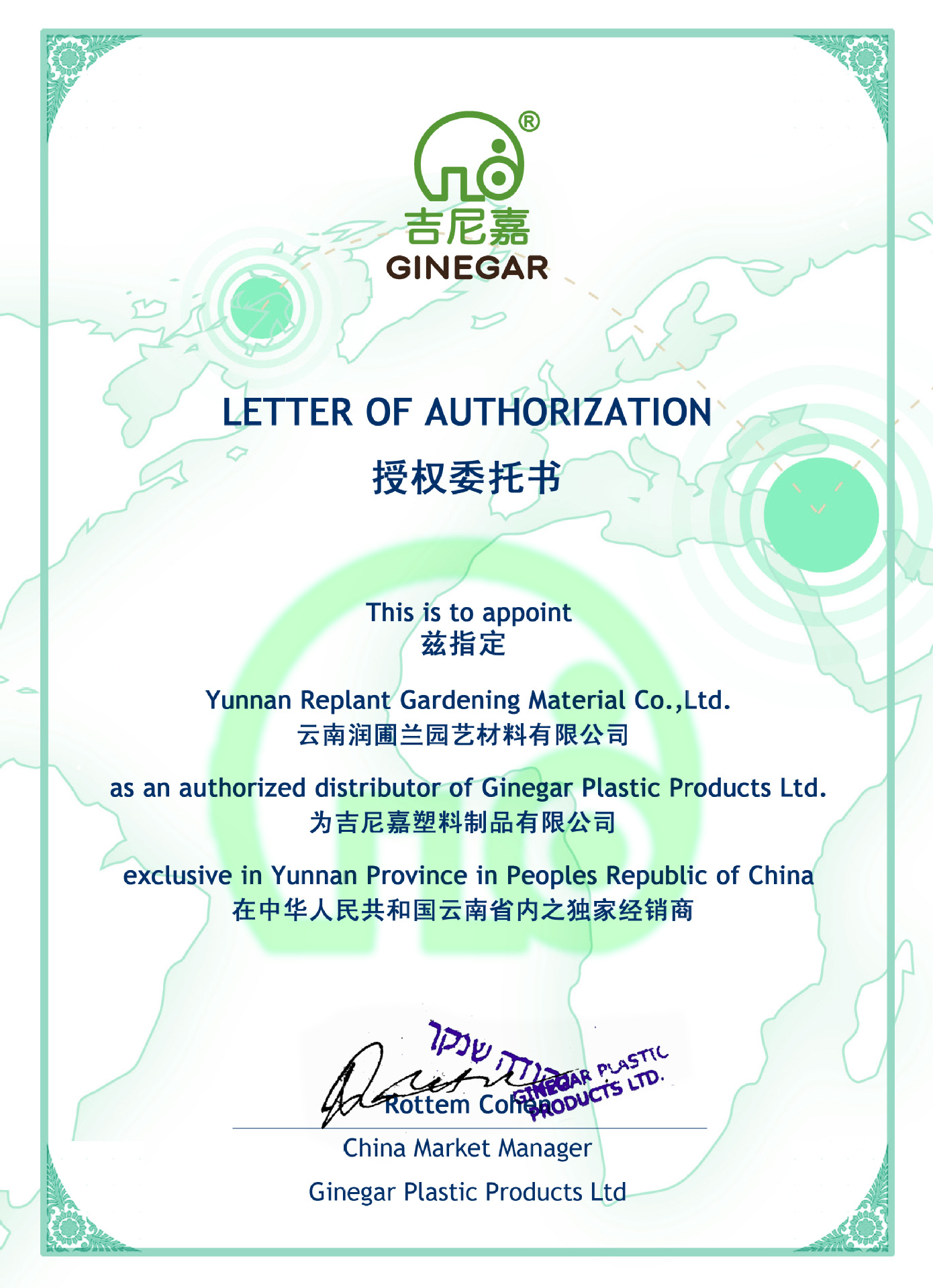 云南润圃兰园艺材料有限公司是经以色列吉尼嘉塑料制品有限公司授权的中国西南区的独家经销商,所售产品完全从以色列进口到中国,所做质量承诺严格按以色列吉尼嘉公司产品标准执行(欧洲标准认证)。