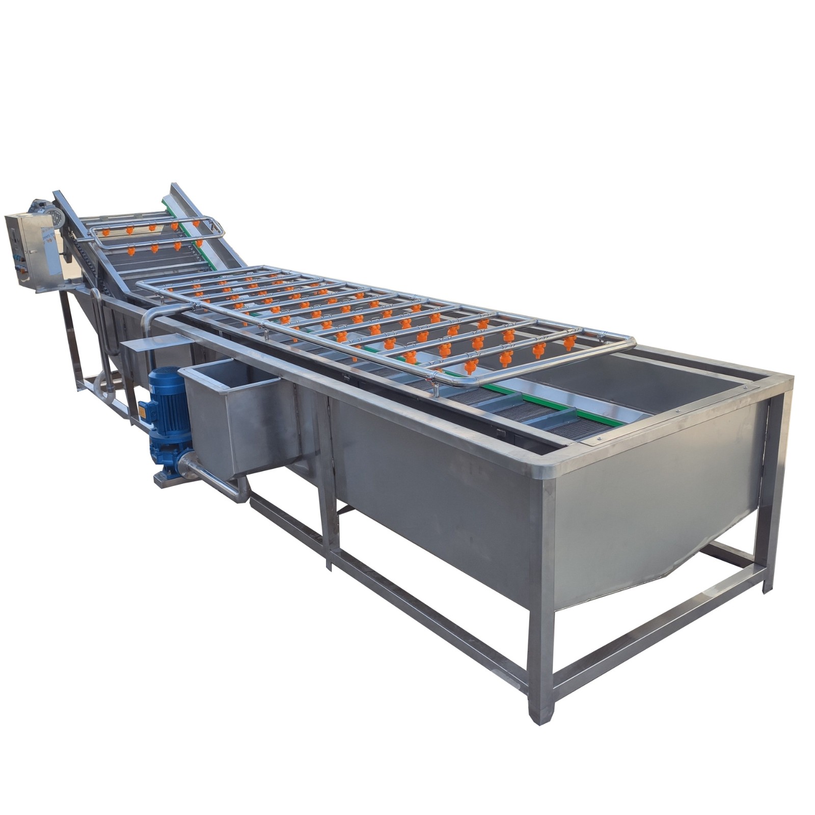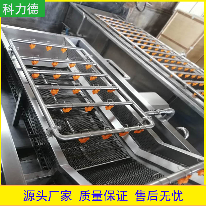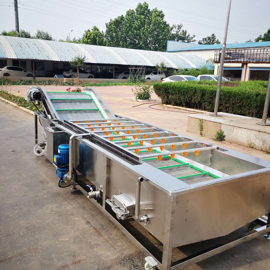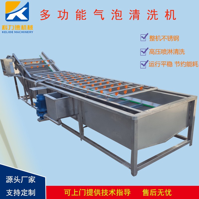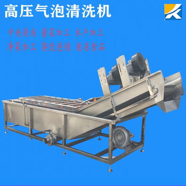 蔬菜清洗机设备除电机、轴承等标准件外均采用不锈钢材料制作,完全符合出口食品卫生要求。设备中设有气泡发生装置,使物料呈翻滚状态,去除产品表面农残功效,同时可加入适量的药剂,进行消毒固色,漂浮物可以从溢流槽溢出,沉淀物从排污口排出,以达到清洗的目的。气泡清洗机是针对外形要求高的物料设计,适用于:蔬菜、水果、水产品、中草药等颗粒状、叶状、根茎类产品清洗、浸泡。