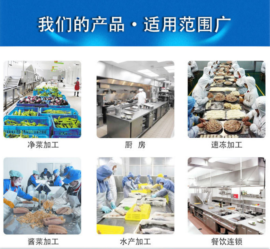 2、适用于:叶菜类、食用菌类、水果、水产品和中草药等颗粒状、叶状、根茎类产品清洗、浸泡、杀菌消毒及固色等。