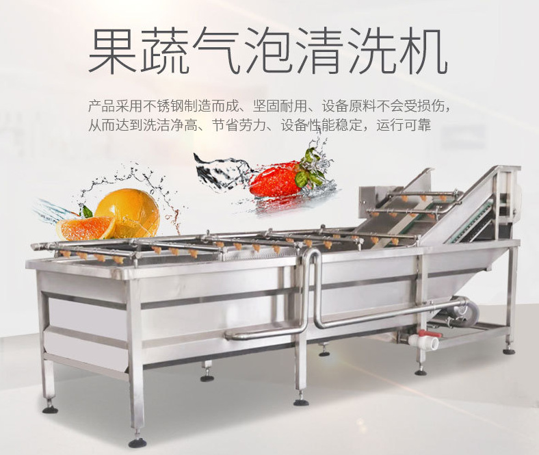 蔬菜清洗机设备除电机、轴承等标准件外均采用不锈钢材料制作,完全符合出口食品卫生要求。设备中设有气泡发生装置,使物料呈翻滚状态,去除产品表面农残功效,同时可加入适量的药剂,进行消毒固色,漂浮物可以从溢流槽溢出,沉淀物从排污口排出,以达到清洗的目的。气泡清洗机是针对外形要求高的物料设计,适用于:蔬菜、水果、水产品、中草药等颗粒状、叶状、根茎类产品清洗、浸泡。