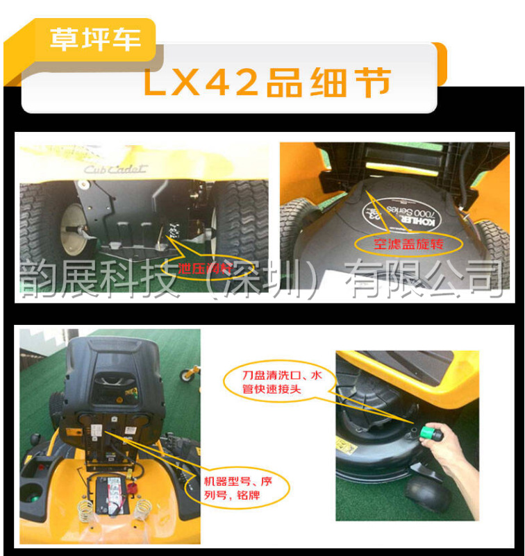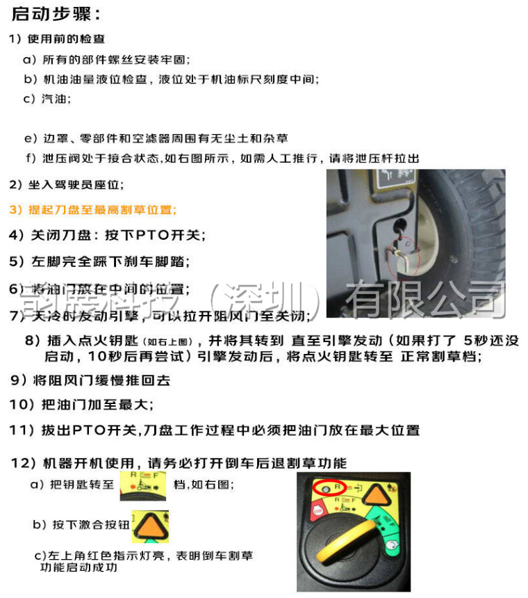 | 安全系统 | 空挡启动,无人状态保护,倒退安全开关,驻车手刹,RevTEK反方向割草技术 |