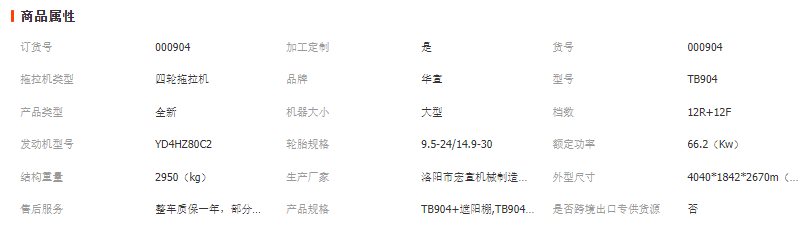 商品描述 本产品为大型货物,不支持无理由退款退货,发货均选用物流运输,物流运输一般都是到市区或者县城自提。拖拉机不包邮,所标价格不含运费,拖拉机型号多,且每个型号运往各地区的运费也不同,无法标注运费,下单前联系客服告知地点,我们会尽量和物流协商优惠的运费。 网上价格为参考价格,详细的价格参数请在下单时联系客服。联系人:程经理,联系方式:13007571156