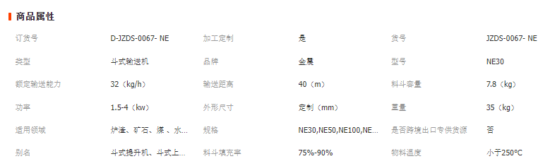 | 大粒度/mm | 物料松散密度(t/m³) | 大提升高度/m | 功率/kw |