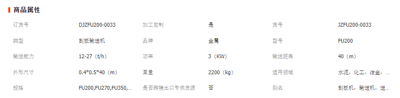 FU 型链式输送机的规格性能列入下表。表中列出了各机型在不同链速下的输送能力范围。同样的输送量可以在表中选到不同的机型,若选用较大机型则链速较低、磨损 小,但设备投资较高,若选用较小机型则链速较快,磨损相对较高,但设备投资较省。应当指出,当实际输送量达不到该机输送能力的65%时,由于机槽内物料层 过薄而造成输送链空转,也会增加设备的磨损。因此,建议输送机的实际输送量不宜低于表一中输送能力的最小值,以实际输送量乘以1.2以后,也不宜高于表中 输送能力的最大值。