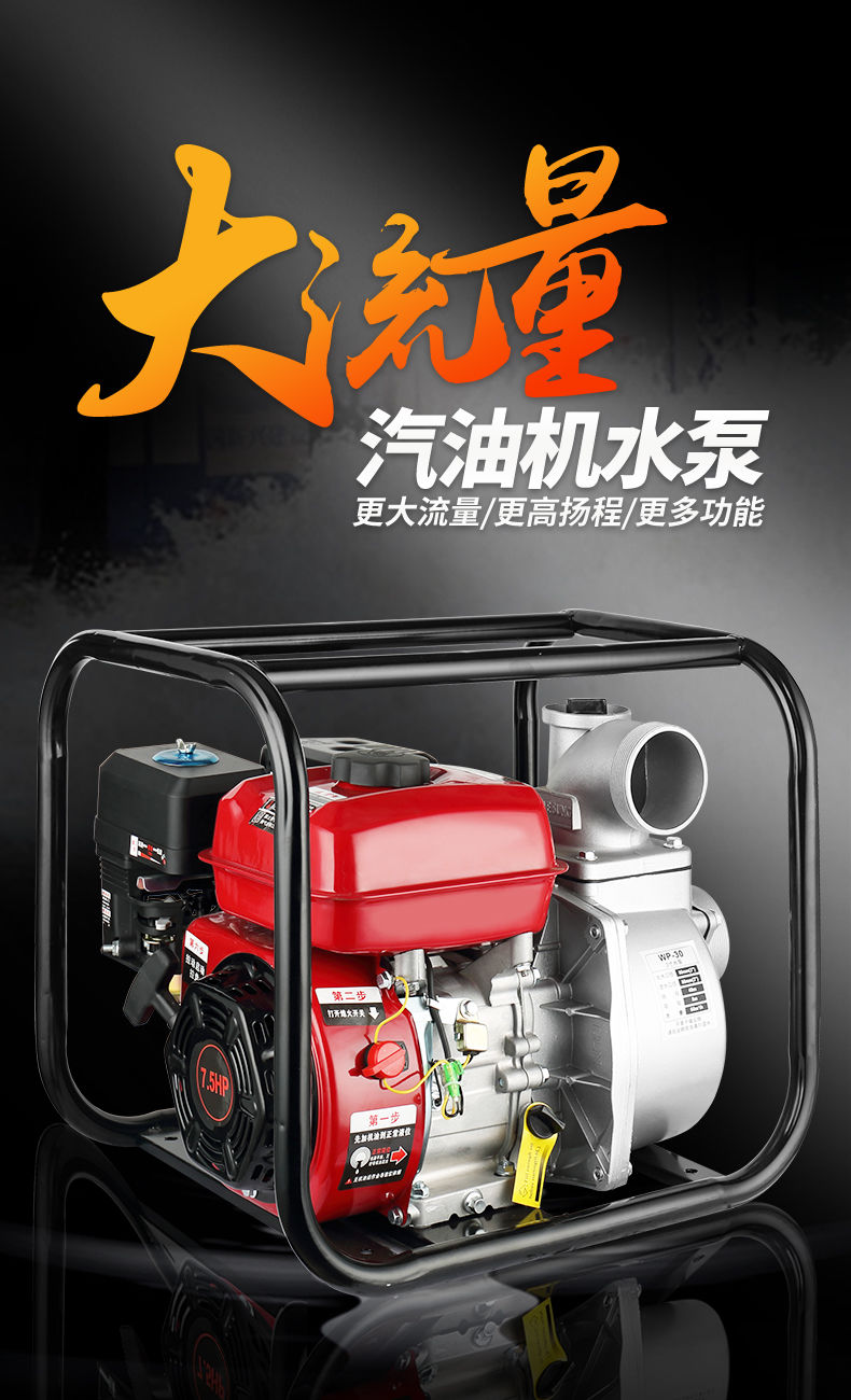 使用前请加入四冲程汽机油:0.6升,邮箱内汽油不能加的太满,泵内无水禁止启动,不用时很好把泵体内的水放净,以免腐蚀泵体,详细阅读说明书。用钢凸轮轴发动机,动力大且很省油,是您理想的选择。