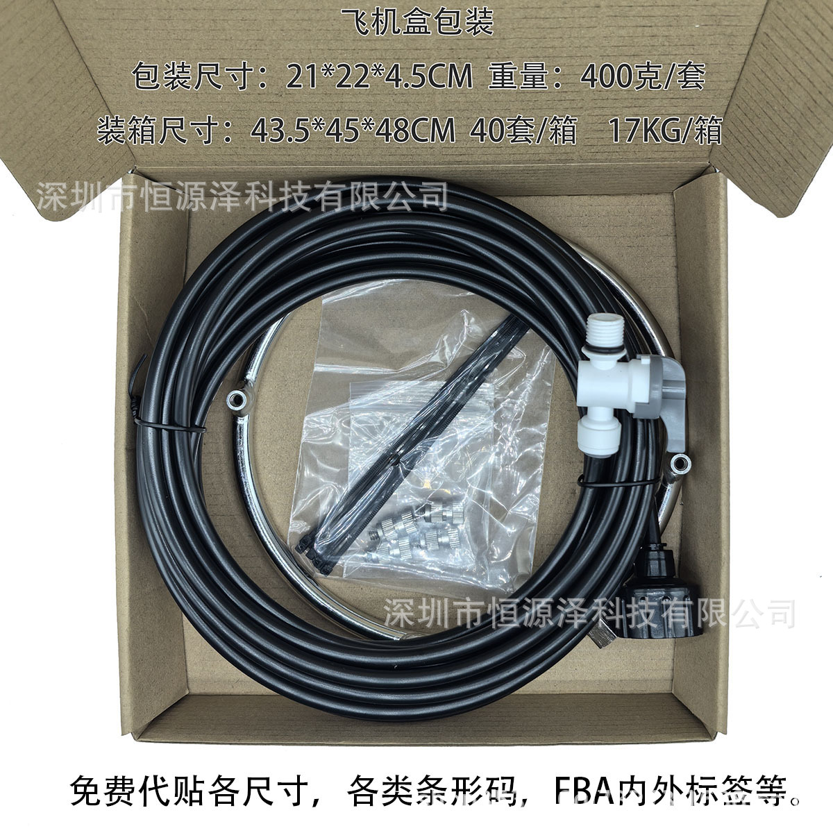 配件清单:不锈钢喷雾环1个,可清洗铜喷头4个,3/4'' 水龙头接头供水管1根(8米管带阀门),扎带10根。