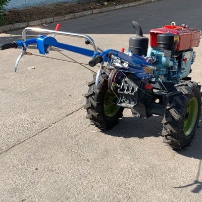 低矮型旋耕机 农用手扶拖拉机 小型耕地机山地手扶拖拉机手扶拖拉机是一种小型拖拉机。欧美称作园圃拖拉机。由发动机,底盘、电气等系统组成的主要用于牵引和运输的多用途行走机械。手扶拖拉机能行驶是靠内燃机的动力经传动系统,获得驱动扭矩的驱动轮再通过轮胎花纹和轮胎表面给地面小、向后的水平作用力(切线力),这个反作用力就是推动拖拉机向前行驶的驱动力(也称喂推进力)。结构简单,功率较小,适于小块耕地。由驾驶员扶着扶手架控制操纵机构、牵引或驱动配套农具进行作业
