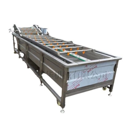 一段:气泡发生清洗段,特设的布气方式,产生丰富的气泡,使物料呈翻滚状态,保证产品多面清洗,去除产品表面污垢、农残功效,同时根据需要可加入适量的药剂,进行消毒固色,漂浮物可以从溢流槽溢出,沉淀物从排污口排出,以达到清洗的目的;