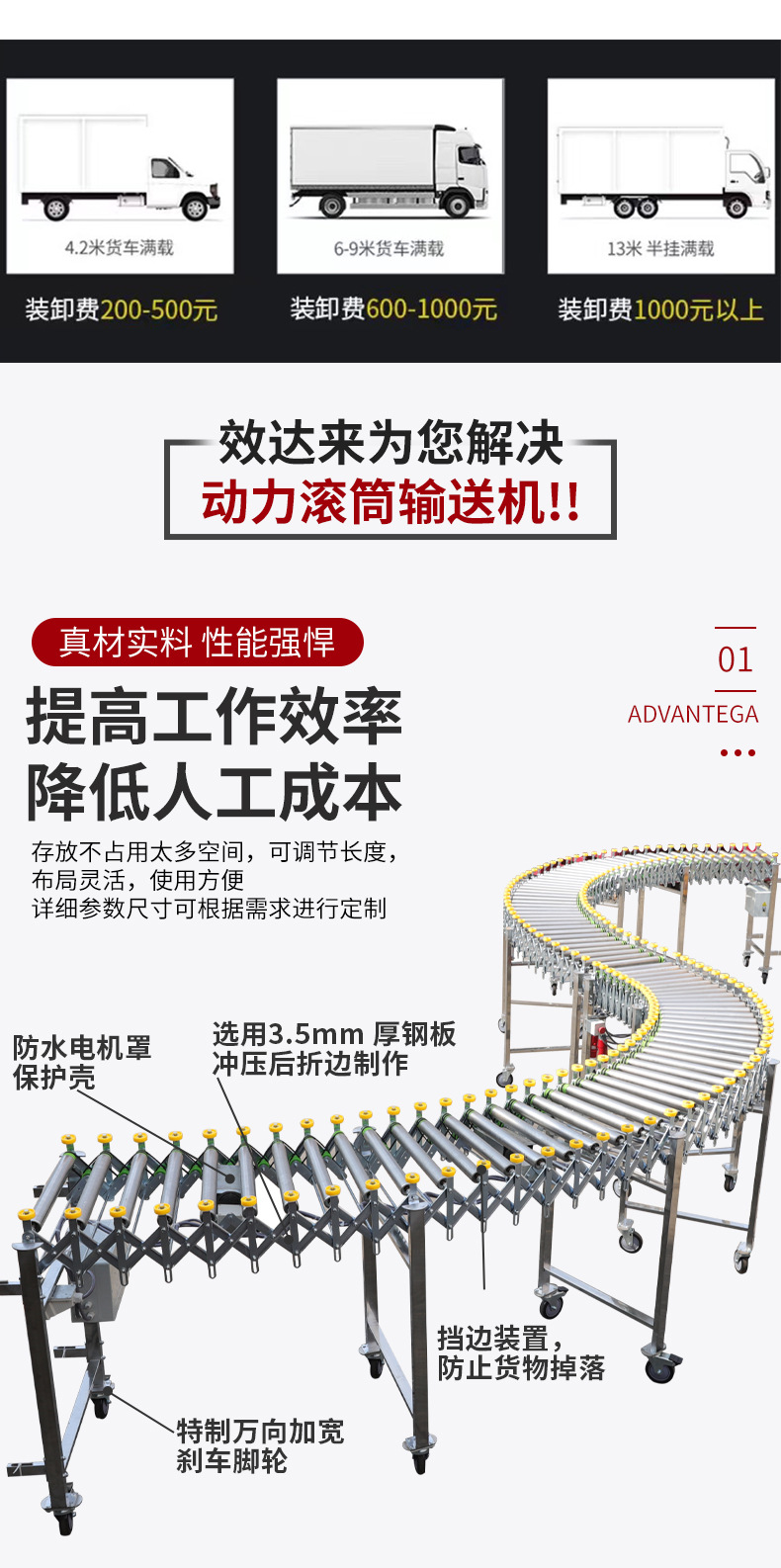 详细信息 加工定制是 货号2 类型滚筒输送机 品牌效达 型号同步带滚筒伸缩机 输送能力50(t/h) 功率1.5(KW) 输送距离按需定制(m) 外形尺寸按需定制(m) 重量50(kg) 适用领域物流仓储 快递市场 纺织市场 果园市场 规格碳钢滚筒,滚筒输送机1米 本店所有产品均为定制产品,下单前请将产品要求发给客服,直接下单不发货 该价格不含运费不含税,仅供参考,实际价格及发货情况请咨询客服,与客服确认后再下单