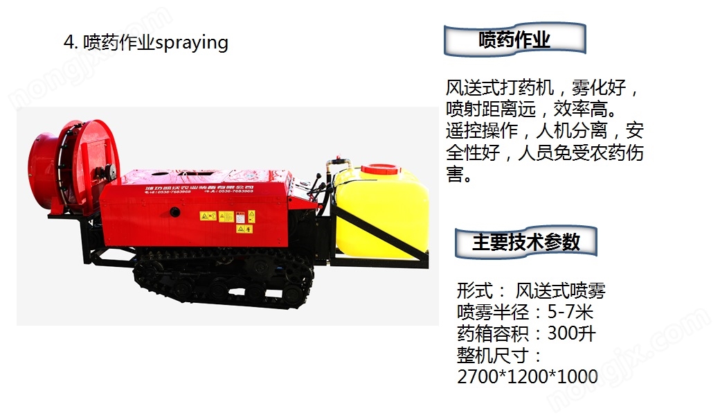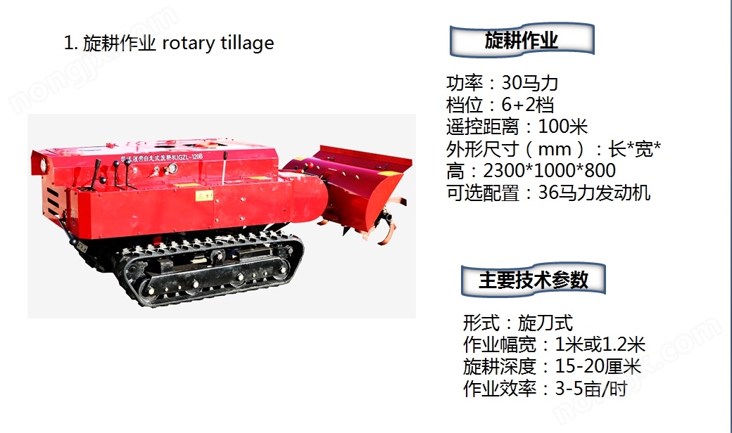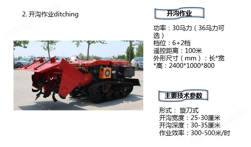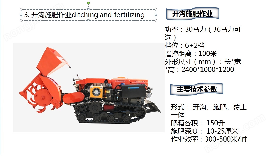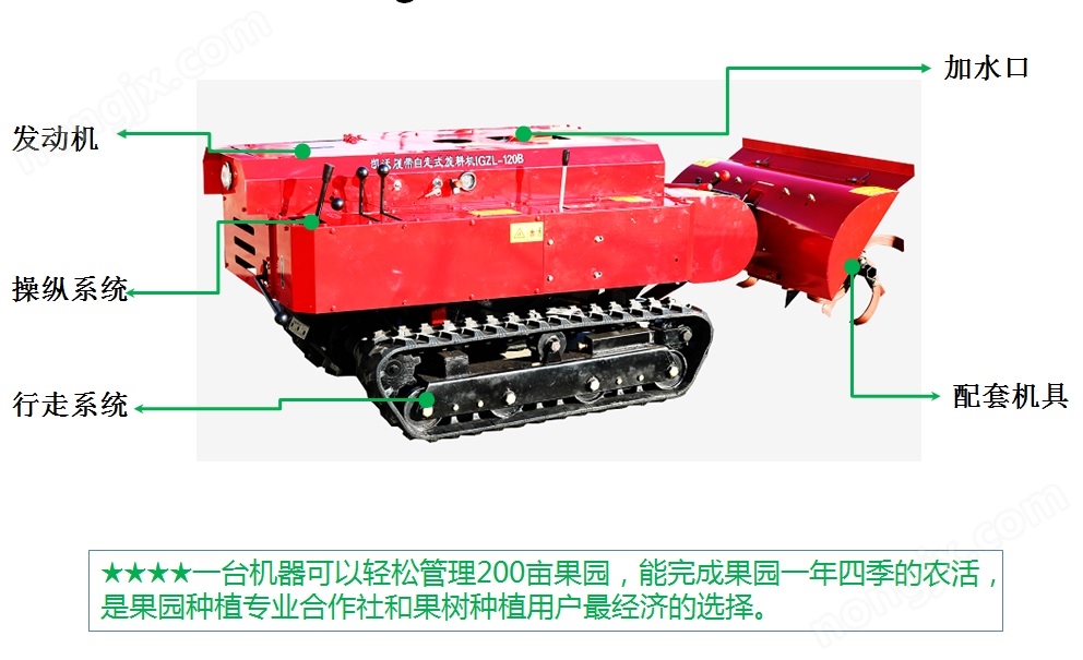 一台机器管理200亩果园,智能遥控操作,解决了果园机械化的难题。主要功能有开沟施肥,旋耕,除草,回填,喷药,运输等等。