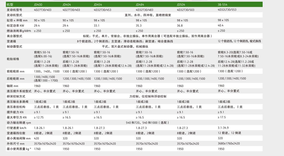 可靠性高、平均故障间隔时间大大高于国家标准;加强型底盘、牵引力大、动力输出功率强劲,作业效率更高;动力输出轴换挡和变速箱副变速都采用啮合套换挡,换挡轻松、不脱挡;常用轮距为1.3-1.5米,非常适合垄距65-75厘米的垄作物作业,四驱车型可选配1.2米前后轮距,以满足更窄垄宽作业需求;挡位分布合理,拥有各种农田作业、运输等所需的理想工作速度,作业效率更高、效果更佳;四驱型自重轻、泥水密封性能良好,水田作业优势明显;匹配浙江新柴“国II排放标准”四缸直喷发动机,扭转储备大于17%、马力强劲、易启动、油耗低;特别适应于全国水田作业,也适应于旱地和草地作业。标配可调摆式拖挂装置,挂点高度3级可调,且可满足用户同时使用动力输出轴(PTO)和拖挂装置的需求(如牵引式喷雾机等)。可配套旋耕机、打浆机、犁、耙、播种机、中耕施肥机、灭荏机、拖车、前装载机、后挖机、开沟机等农机具。