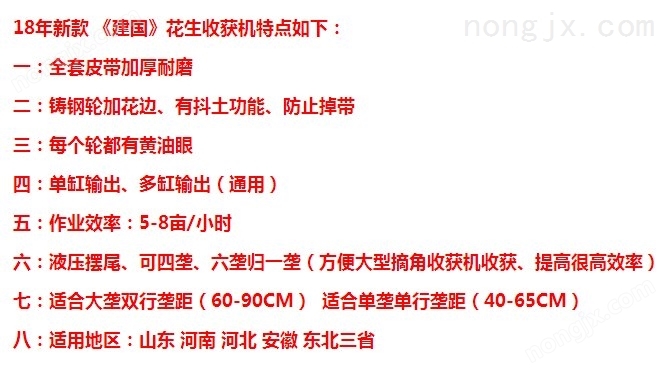 [视频]建国牌2H-1花生收获机[视频]《建国》花生收获机作业视频建国牌2H-1花生收获机产品介绍《建国》2H-1型花生自动收获机,结合合理的种植方式,可两垄合一也可四垄、六垄进行收获作业,每小时收获花生3-5亩,是人工作业的40倍,圆盘旋转摆秧的巧妙设计,可大大减少果实的损失,很少造成秧果脱落,即使有掉果现象发生,果实已在地表,不必再次挖掘,果实损失减少20%左右