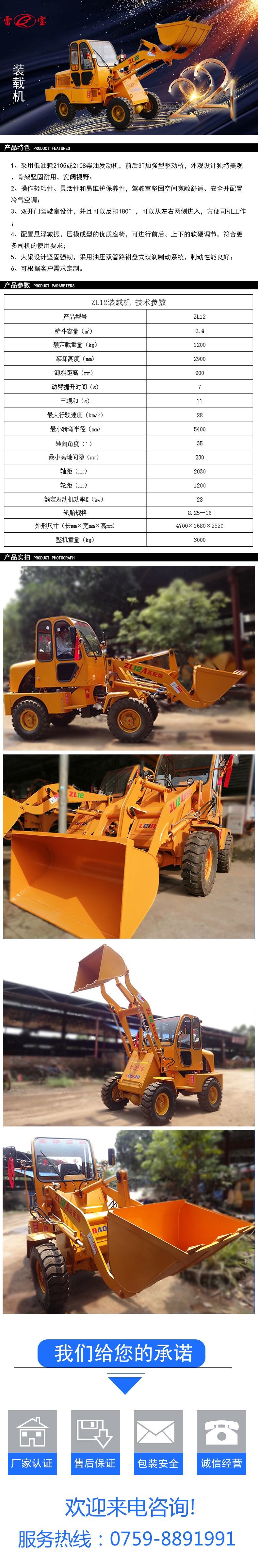 详细信息 订货号1 品牌雷宝 型号ZL12A高配版 货号1 额定载重2900mm 装载机械类型小型装载机 动臂提升时间7(s) 铲臂提升时间-(s) 最大牵引力-(kN) 额定斗容量0.4(m3) 发动机功率37(kw) 整机重量3.1(t)