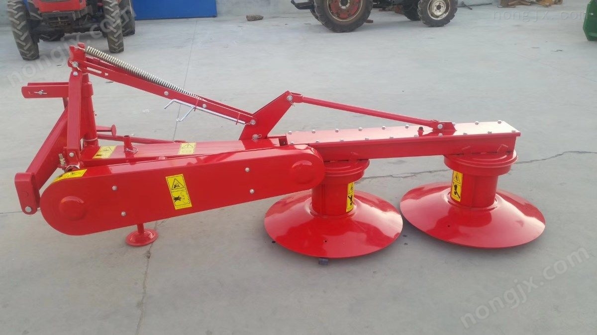 后置双盘割草机,主要用于各类牧草的收割。采用割草机连接到拖拉机后侧悬挂牵引架,以动力输出轴带动作业。该机有两个高速旋转刀盘,每个刀盘上装有叁把刀片,可高速作业达每小时15亩,生产率高
