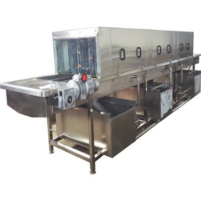 本机采用四周高压喷淋原理,把周转箱开盖后扣放在传送网带上平行前进, 高压喷淋四周清洗,清洗共分为三段,第一段采用热碱水(或加洗洁精)高压喷淋清洗,第二段采用热水冲洗,第三段采用清水喷淋冲洗,起到降温和彻底去除残留物作用,三段喷淋独立进行,但又相辅相成,其中第三段清水流入第二段水箱中,第二段水箱中带有加热管,加热温度可调(最高96°),第二段水箱水满后流入第一段水箱中,第一段为最脏水,带有溢流口流出,结构合理,节约用水。清洗三段各有高压循环水泵循环喷水,清洗完毕后直接进入下道工序—强力除水机。
