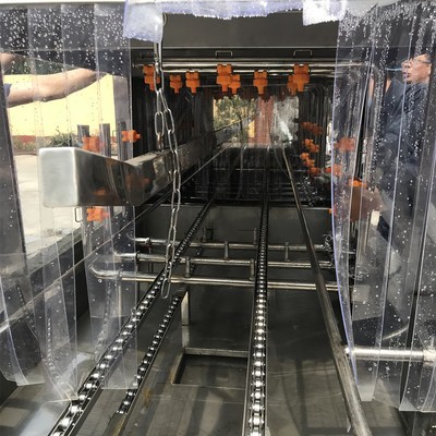 输送系统采用变频调速电机带动,调节电机速度以控制清洗时间。该机侧导向机构可调以,适应不同规格清洗物品。