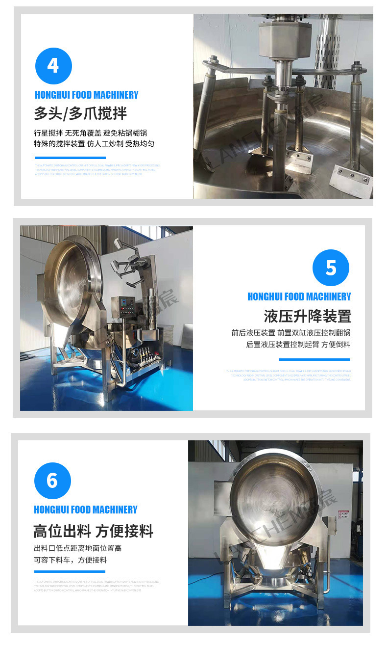 5、锅体翻转系统:液压升降方式,实现搅拌与锅体分离后进行液压倾斜倒料,可倾斜90°角,倒料干净,易于清洗,降低劳动强度。