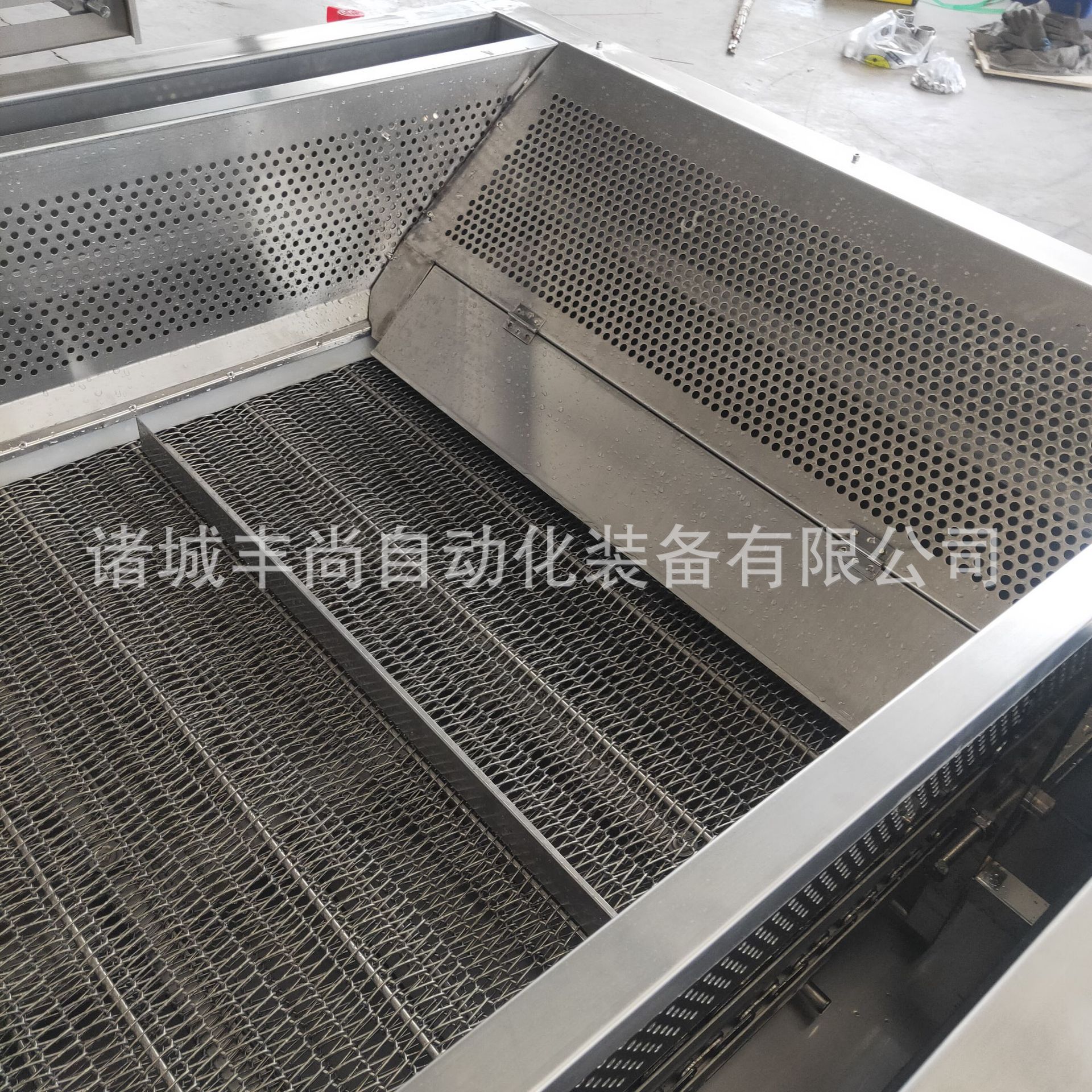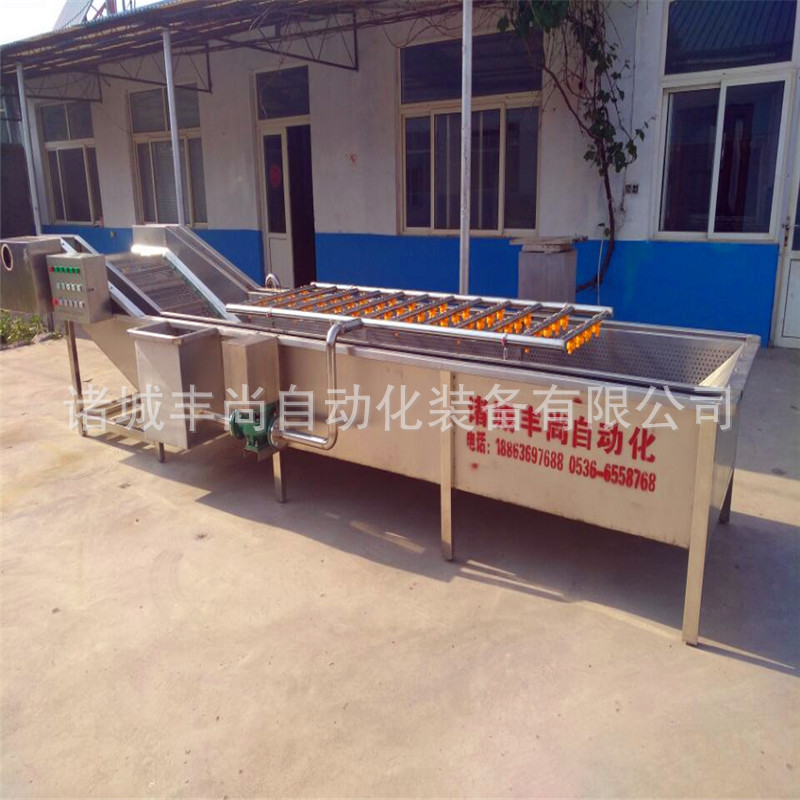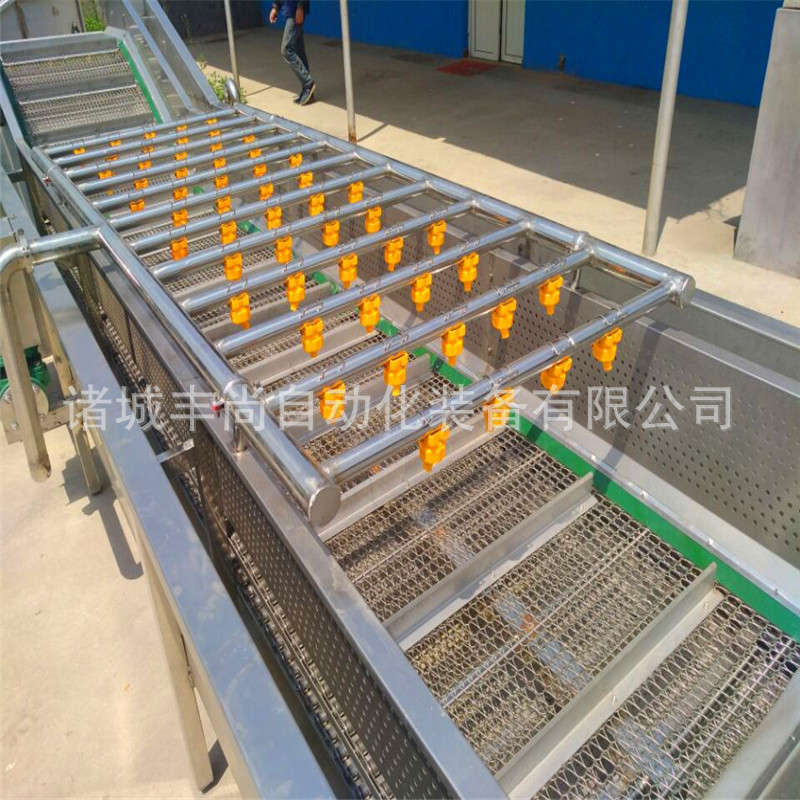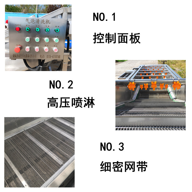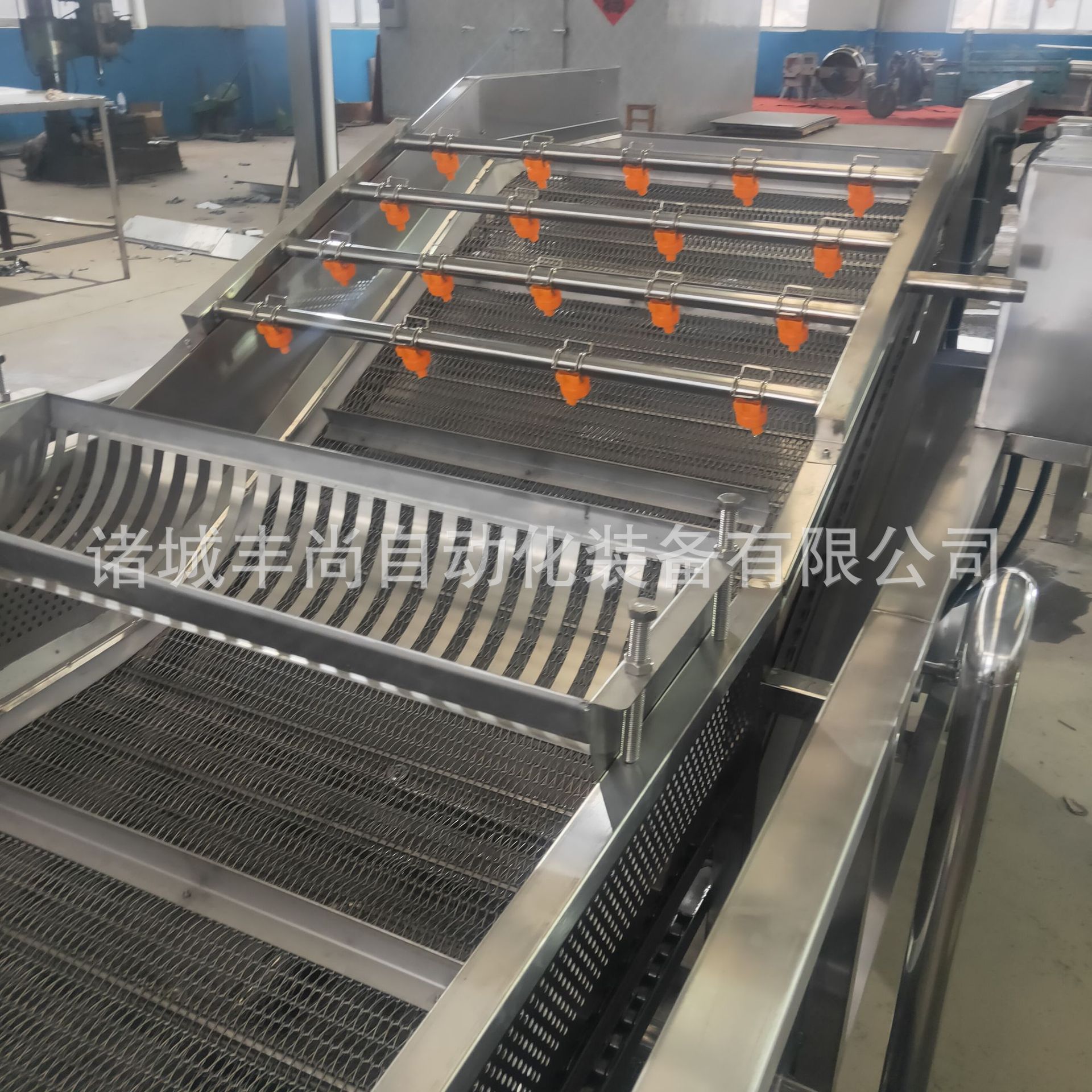气泡清洗机是水果,蔬菜,水产生产线中的重要产品,主要用于水果,蔬菜,水产的清洗。气泡清洗机的原理主要是利用箱体前部分设备箱体中注适量的水,原料在经过箱体时,会与气泡机和水的结合作用下做翻滚状态,并随网带不断向前推进,在出水面时,设有喷淋头,高压冲洗。 气泡清洗机是针对外形要求高的物料设计,适用于:蔬菜、水果、水产品、中草药等颗粒状、叶状、根茎类产品清洗、浸泡。