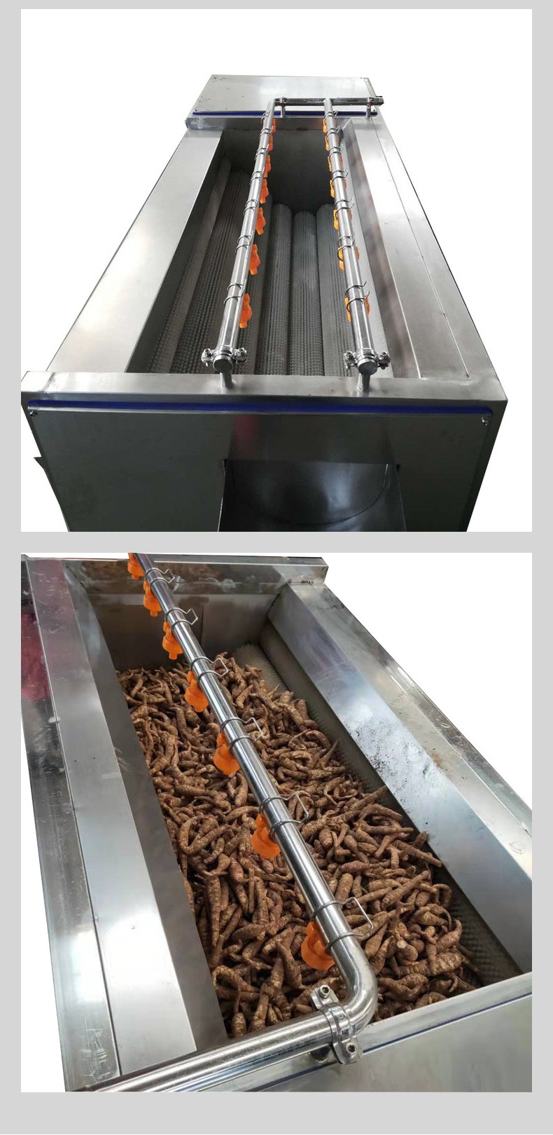 将根茎类蔬菜或球类果品放置在九根可滚动的毛辊组成的U型料斗里,使物料与旋转的毛辊接触产生表面摩擦,使物料清洗去皮。清水从喷淋管中喷出冲洗物料,从而达到洗净的目的。