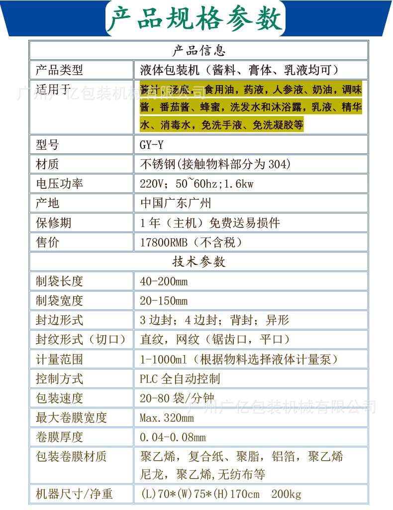 | 功能 | 灌装,封口,充填,打码、喷码,制袋 | 品牌 | GY | 型号 | GY-Y |