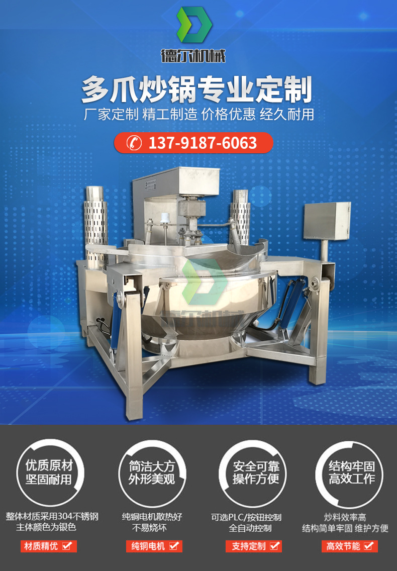 详细信息 订货号DR-DZ650 加工定制是 货号DR-DZ650 种类调味品加工机械 品牌德尔 型号DR-DZ650 电压380(V) 功率3.7(kw) 产品用途食品炒制 外形尺寸2000*2500*1900(mm) 净重800(kg) 包装缠绕膜 营销特价 售后服务一年保修,终生维护 规格定金, 多爪行星搅拌炒锅全自动酱料火锅底料炒料机大型商用燃气加热炒锅 您刚好需要,我们正好专业 合作只是开始,服务永无止境