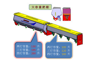 1. 肥箱断面为梭形,容量增大;增加重力调平指针,进行播种机深度调整时有了参照。