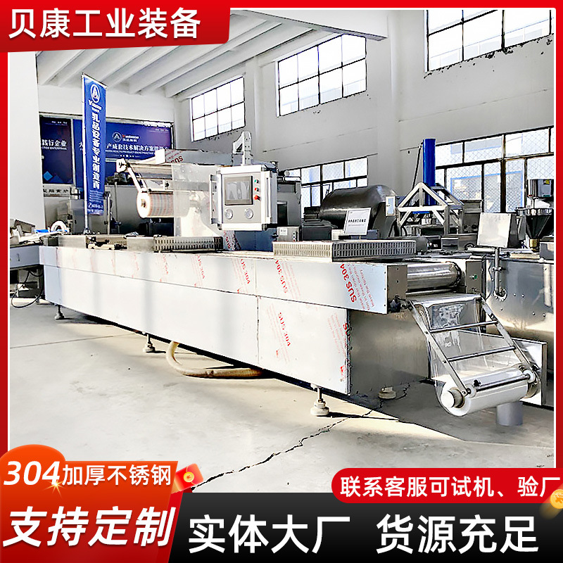 设备采用光电跟踪,可选用彩盖膜或光膜进行包装.降低成本、提高产品档次。组合模具,更换方便、一机多用,模具具有冷却系统。可以根据用户产品包装要求,可配备自动喷码或打码系统。根据用户产品包装要求,在抽真空的基础上可以充氮气或混合气体。配有世界一-流的原装德国BUSCH RA0203真空泵.且内雪原装德国BUSCH Ra0040真空泵.真空度高,质量稳定,耐用可靠。备有边角废料回收系统,保持环境卫生。采用先进的横切、纵切系统.电脑调刀.