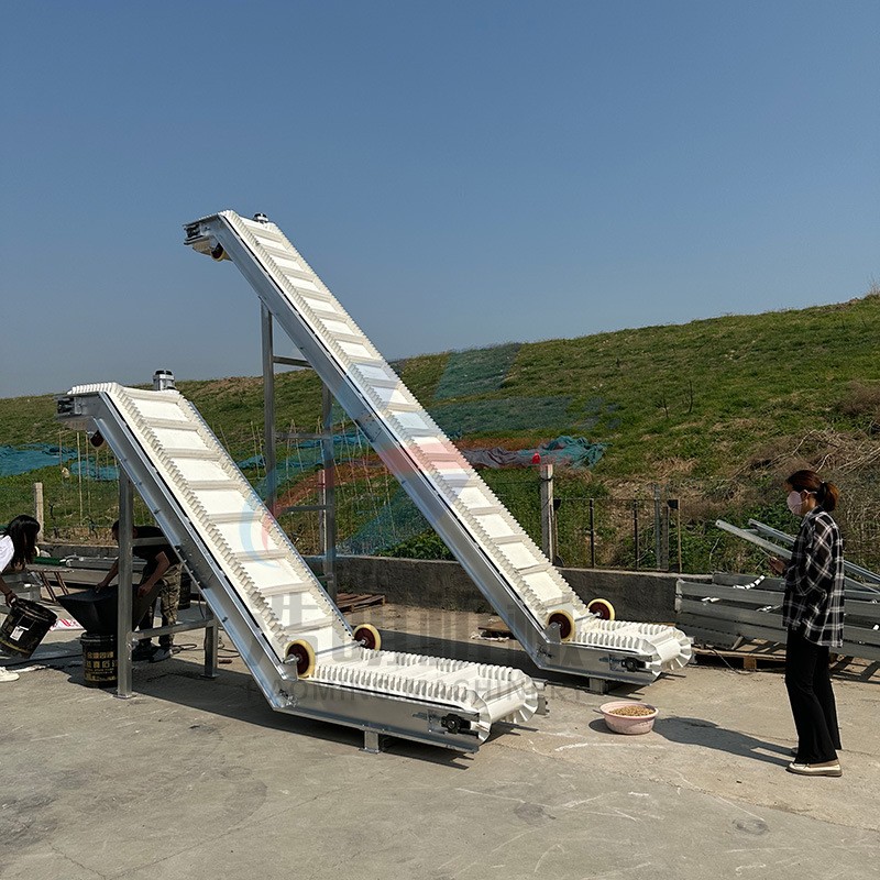 PVC裙边皮带输送机的输送带材质为PVC,输送带上面有横隔板,两边有裙边,适合倾斜角度较大的场合适用。相对于普通皮带输送机有着输送角度大、占地面积小等特点。常用来短距离的输送、上料、提升用途。