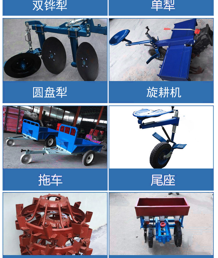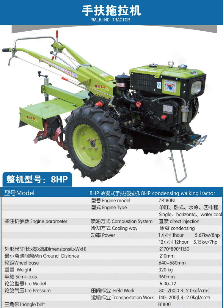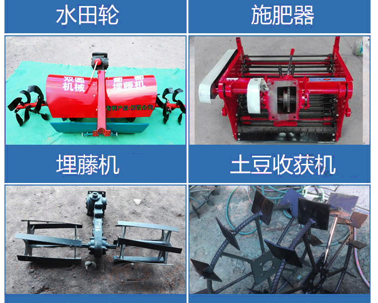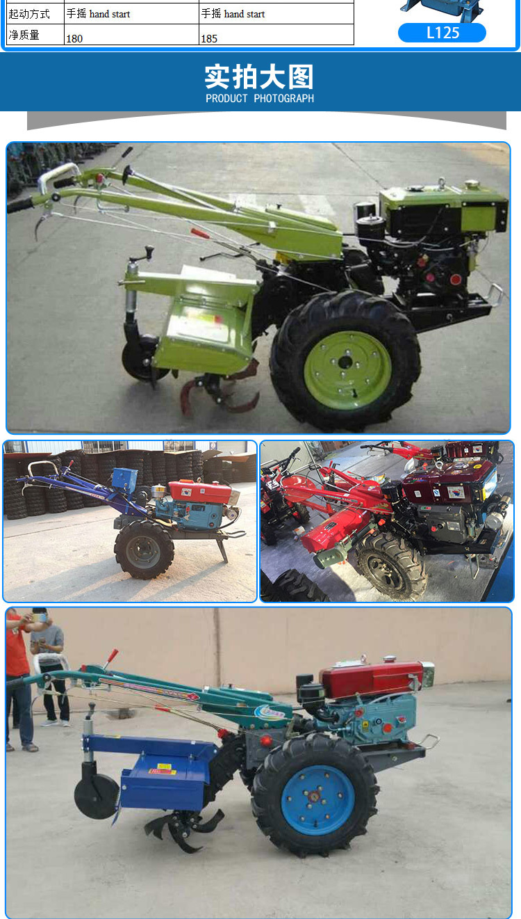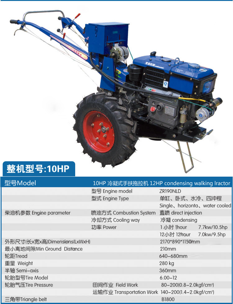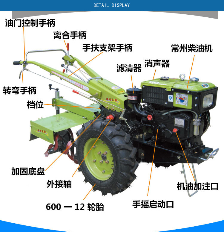 五孔箱体,490加粗轴,半轴长440,王字档,方把,三槽双离合器,600-12玛钢圈,加长加厚柴油机架。8-25马力才柴油机可选