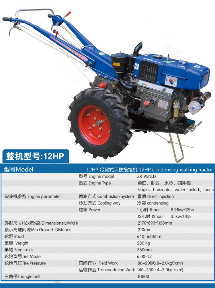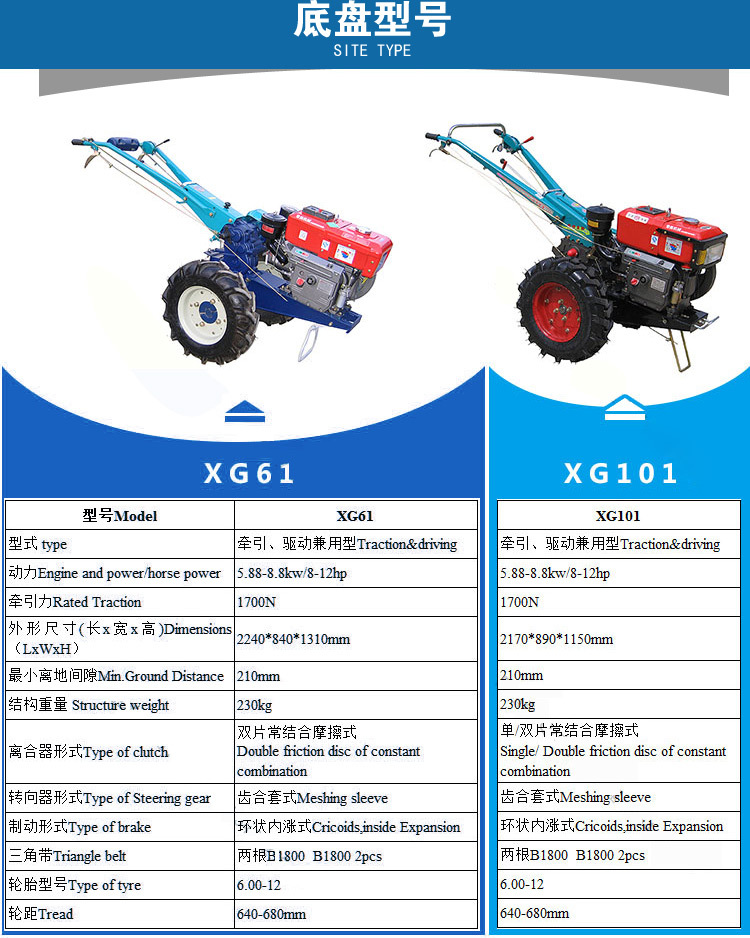 四孔箱体。王字档,方把,两槽离合器,600-12钢板护圈。8-25马力才柴油机可选