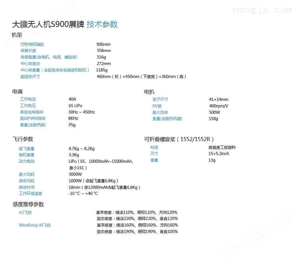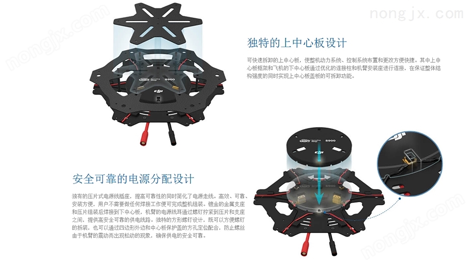 S900 采用 V 型 6 旋翼设计,主要结构部件均采用质量强度比*的碳纤维复合材料,在保证机身结构强度、刚度的同时大幅减轻重量。机身结构的系统性能兼容 DJI WKM/A2 多旋翼飞控。快速的响应频率使你获得流畅的操纵感,更轻的质量使飞机的续航时间进一步加长。