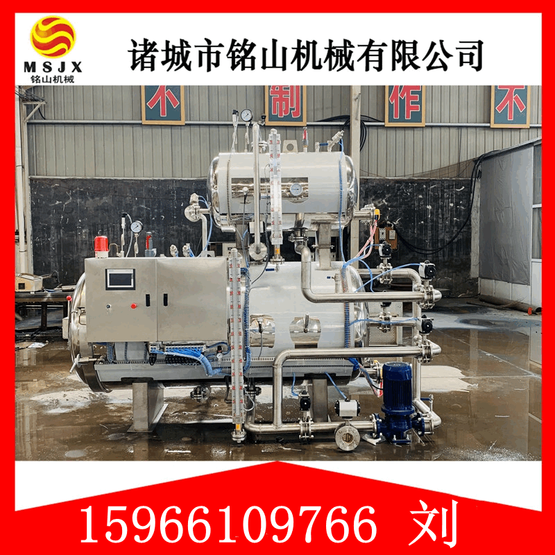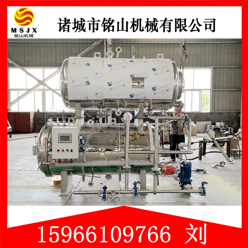 高温杀菌锅装有排汽管、进水管、安全阀、压力表、温度计、排水管、排气阀、液位计、电加热棒、盛装小车。加热层有保温材料,设计时考虑到传热面积和换热效果达到规定杀菌要求,劳动强度低,生产效率高等优点,很受用户欢迎。