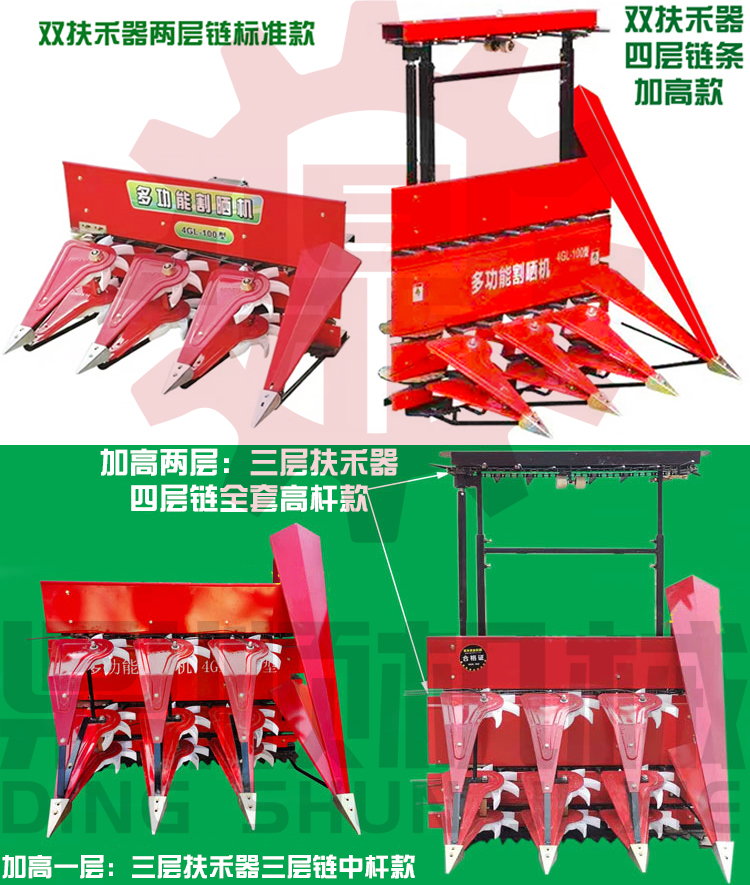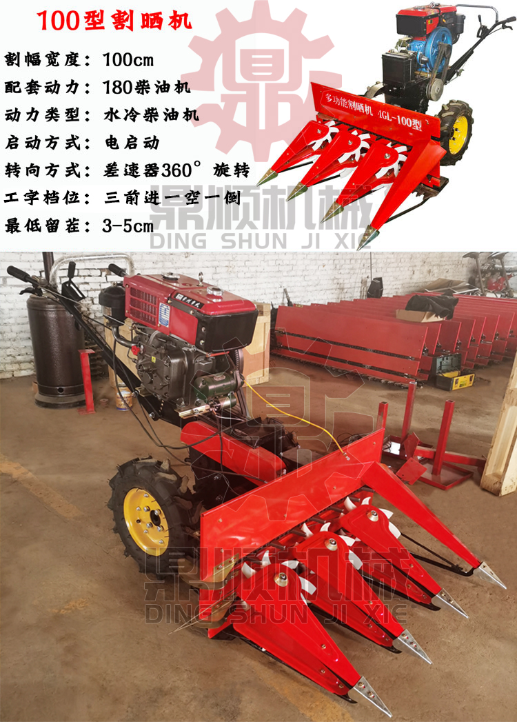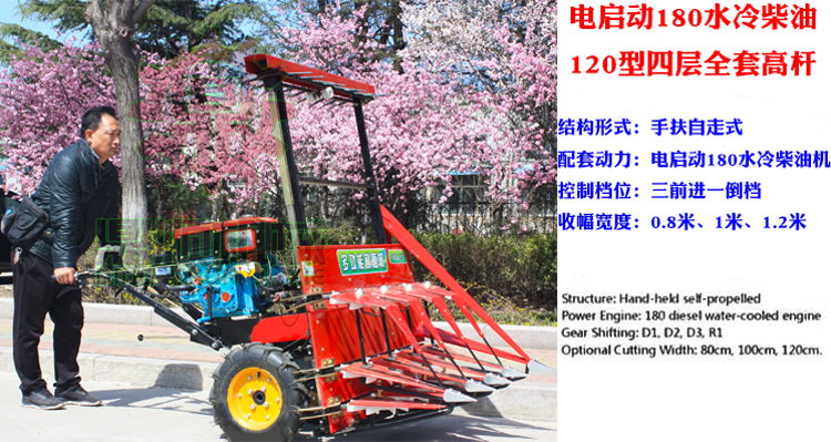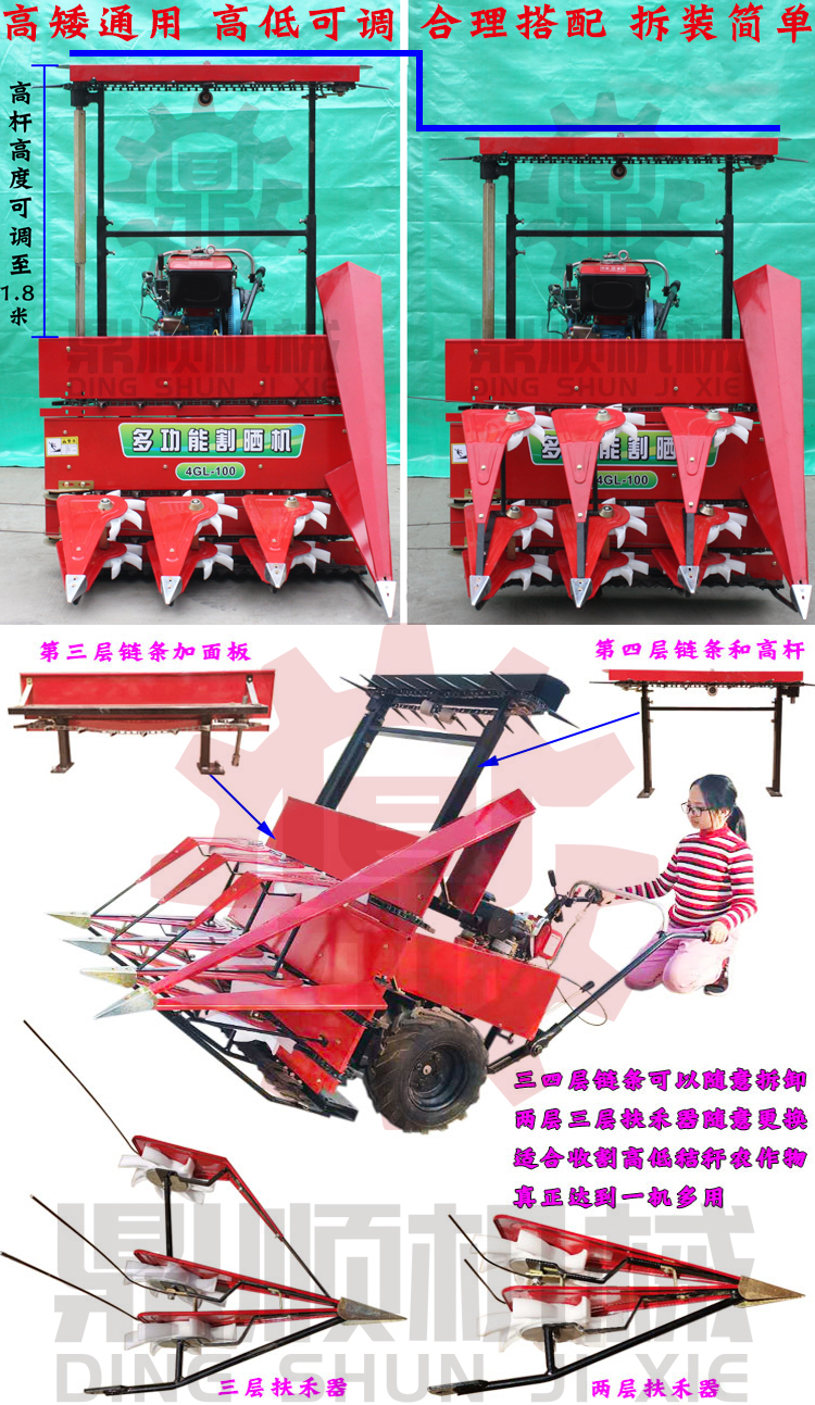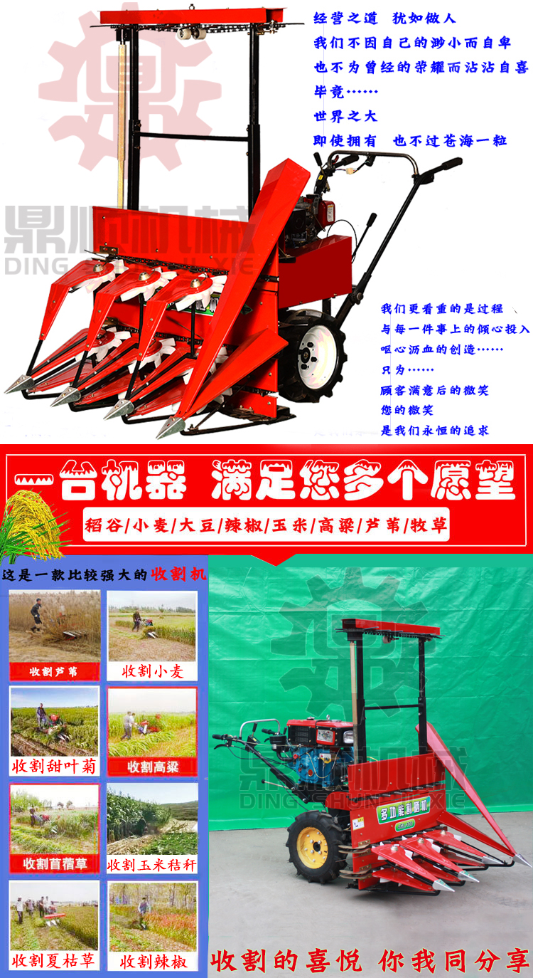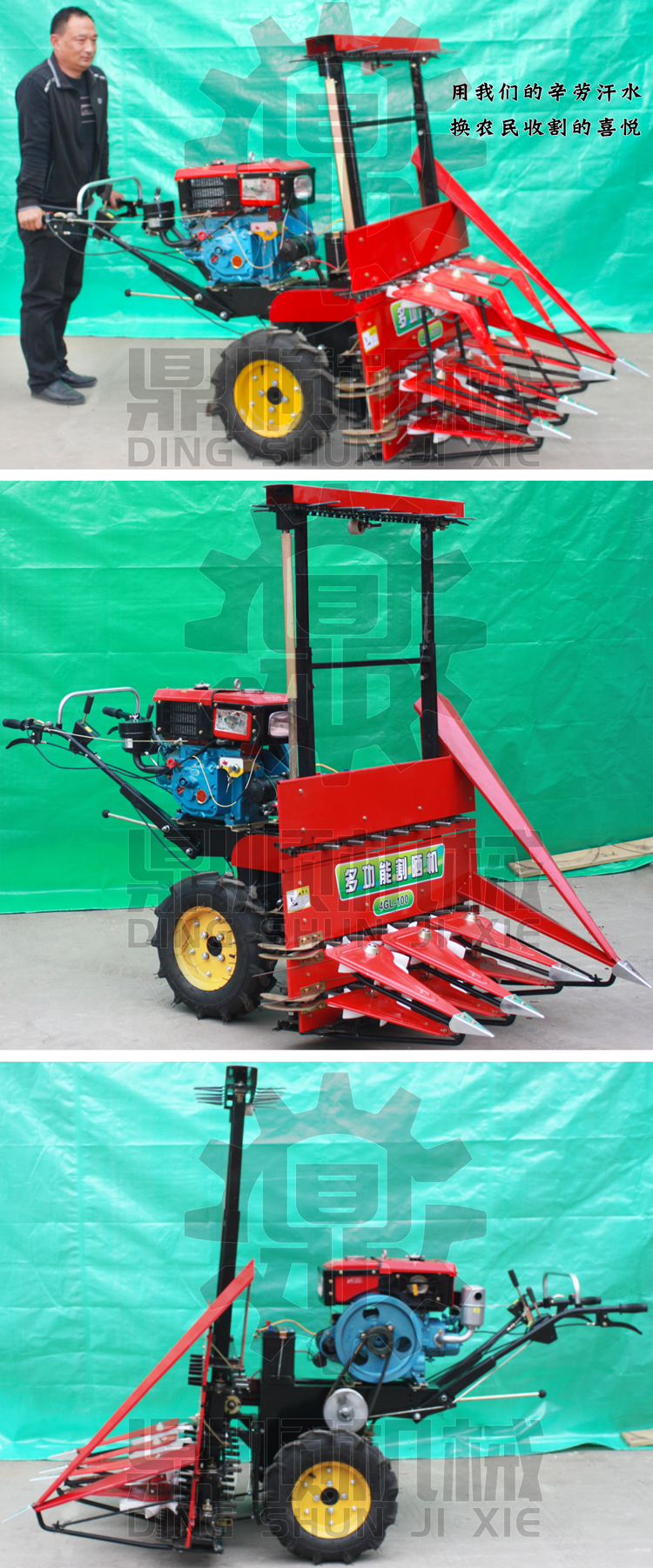 汽油/柴油自走式多功能割晒机:该机具有结构简单、合理、操作维修方便、体积小、重量轻、能耗低、性能稳定、可靠性好、适用性强、搭配合理、拆卸简单方便等特点。广泛适用于平原、丘陵、山地、高原、盆地、梯田等,可以收割稻麦、大豆、牧草、玉米秸秆、高粱、辣椒、芦苇、药材等单株直立植物。还可加立刀收割作物枝条上面有缠绕的农作物如:苜蓿等。有效割幅宽度有80、100、120厘米,适合收割0.5-3米高度的作物,配套动力强劲,该机每小时收割2.5-5亩左右,是人工收割的20倍,真正解决了农民朋友小地块的收割难题。