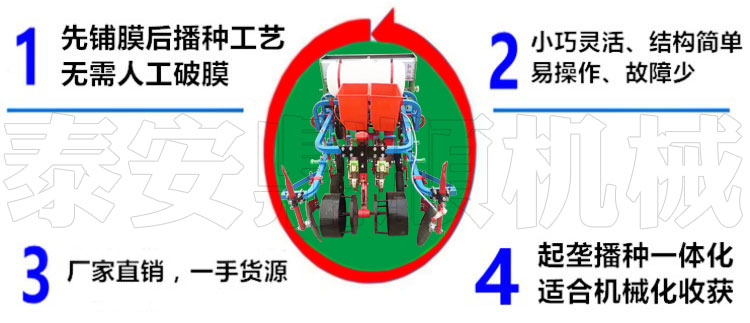先播种后覆膜播种机功能:起垄、播种、施肥、喷药、压垄、覆膜(可选择起垄覆膜和起垄不覆膜款式)。