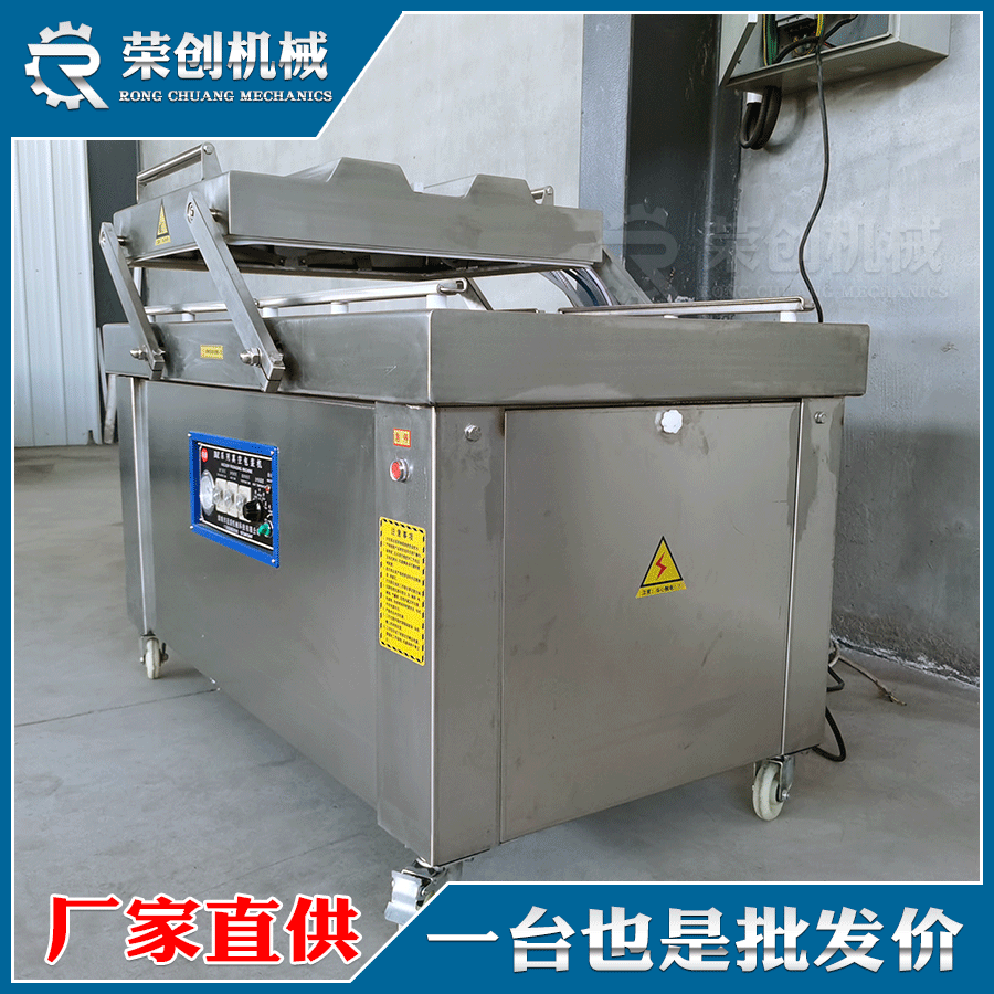 荣创真空包装机是由:真空泵、电机、真空室、封口条、全不锈钢上盖、气囊、电磁阀等组成的。真空包装机能够自动抽出包装袋内的空气,达到预定真空度后完成封口工序。亦可再充入氮气或其他混合气体,然后完成封口工序。真空包装机常被用于食品行业,因为经过真空包装以后,达到长期保存的目的。食品的保质期不是简单的公式可计算出来,可能可分成数千种不同的加工食品。一般情况下是以加工好置入包装内,在常温或特定温度下,其产品质地开始受杂菌的侵入而变质的安全期,经过模拟演算及实测而取得保质期。