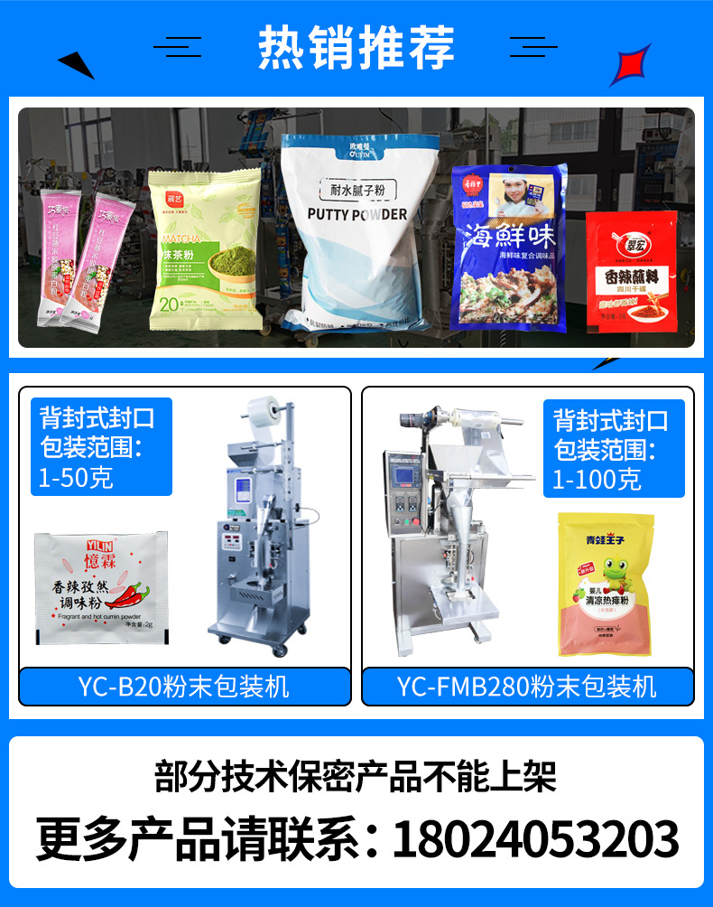 详细信息 订货号YC20201010021 加工定制是 货号20201010021 功能打包,灌装,计量,封口,充填 品牌优创机械 型号YC-BZ021 电压220(V) 功率1.8(Kw) 包装膜宽30-280(mm) 制成袋尺寸15-140(mm) 包装速度60(袋/分钟) 重量300(kg)