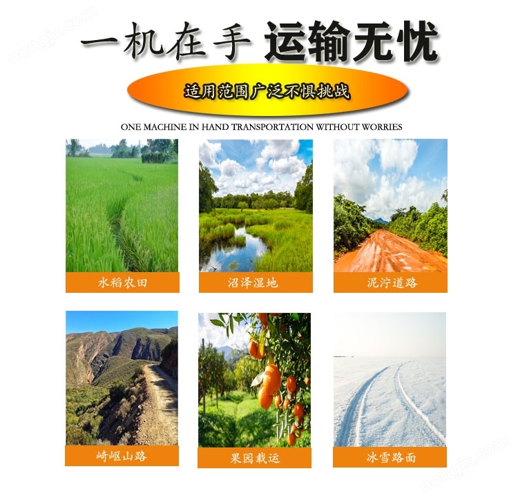 能适应水稻田、沼泽地、泥泞的田间道路、崎岖的山路、松软的草地、山林和沙漠、湿滑的冰面和雪地等复杂恶劣路况,在农林果园运输、货场装载、水利建设、基建工程、矿山场所应用广泛。
