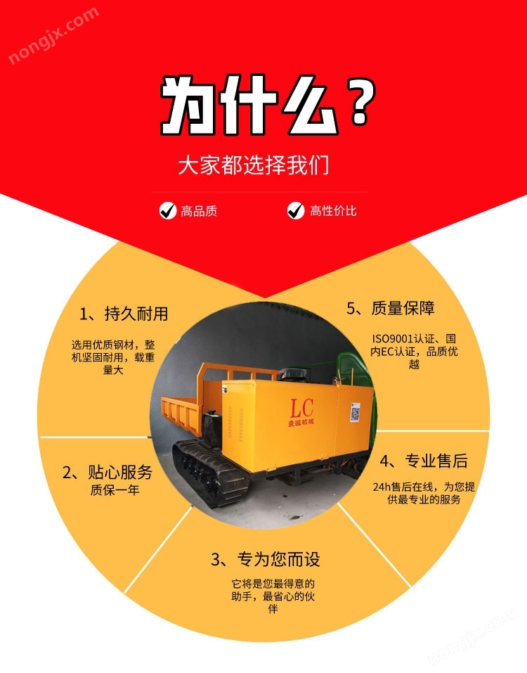 配有液压起降、自卸功能,且自卸角度可调,降低劳动强度,提高运输效率;配备电启动,手柄集中,操作方便;底盘支重轮、导向轮、拖带轮采用滚力轴承,定期加注一次黄油润滑,免使用中维护和保养。