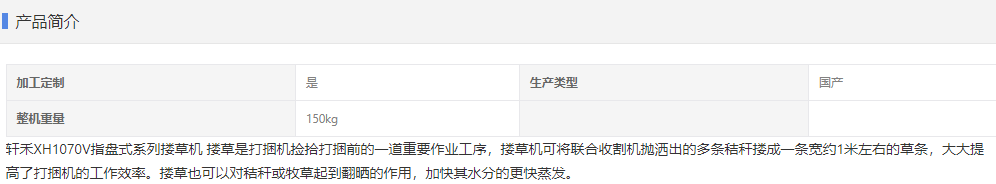 轩禾XH1070V指盘式系列搂草机 搂草是打捆机捡拾打捆前的一道重要作业工序,搂草机可将联合收割机抛洒出的多条秸秆搂成一条宽约1米左右的草条,大大提高了打捆机的工作效率。搂草也可以对秸秆或牧草起到翻晒的作用,加快其水分的更快蒸发。轩禾XH1070V指盘式系列搂草机 根据近些年不同作物、不同季节以及不同作业环境,精心打造的一款产品。整机设计的底坐较高,明显区别于市面上大多数同类产品,有效防止了较厚草料搂草时出现的堵塞现象,尺盘整体采用了进口优质材料,弹尺的弹性更好,且弹尺不易变形和损坏,搂土更少。 ★ 整机设计的底盘较高,有效防止了较厚草料搂草时出现的堵塞现象 ★ 尺盘整体采用了进口优质材料 ★ 尺条的弹性更好,不易变形和损坏,搂土更少 型号 XH1070V 搂草盘数量 10 小搂草宽度 5.8m~6.9m 大搂草宽度 6.9m 小草条宽度 0.5m 大草条宽度 2.2m 运输宽度 2.2m 运输高度 1.5m 运输长度 4.4m 大速度 22.5 Km/h 大重量 770 KG 轮胎规格 ST205/75R15 轮胎压力 350 kPa(3.5kgf/cm2) 配套动力要求 牵引功率(*) 22.4 KW 小重量 572 KG 液压遥控阀数量 不少于1个 低液压流量/压力 在105帕系统压力下为23升/分钟