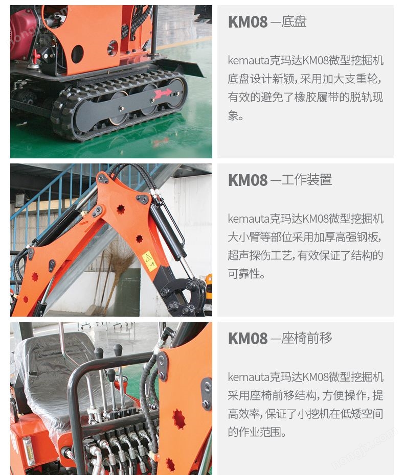 微型履带式挖掘机KM08专为低矮狭小空间设计,该小挖机宽度720mm,高度1250mm,机身尺寸紧凑;应用领域广泛,例如:葡萄园、果园、蔬菜大棚、室内等狭小空间;人性化设计,设计简便,初学者上手快,维修保养极其方便;耗油量低,降低作业成本,解放劳动力,提高工作效率,低投资、*。