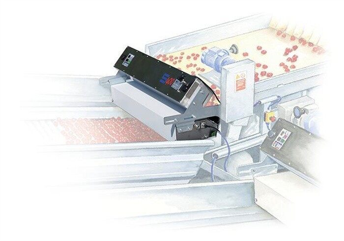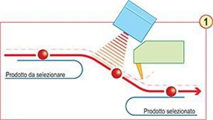 将水果分布在机器送料带上,放置摄像机进行扫描,以覆盖整个送料带宽度。在不到千分之一秒的时间内,该材料就会被系统查看,并被宣布为“合适的”或“不合适的”。如果是后者,则位于较低气动单元上的智能喷射器将其拒绝,该智能喷射器通过喷射器以毫米精度撞击污染材料。所有合适的材料都被保存起来,并继续运往下一道工序。