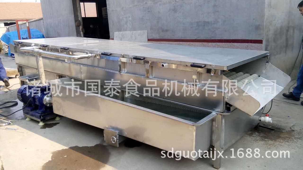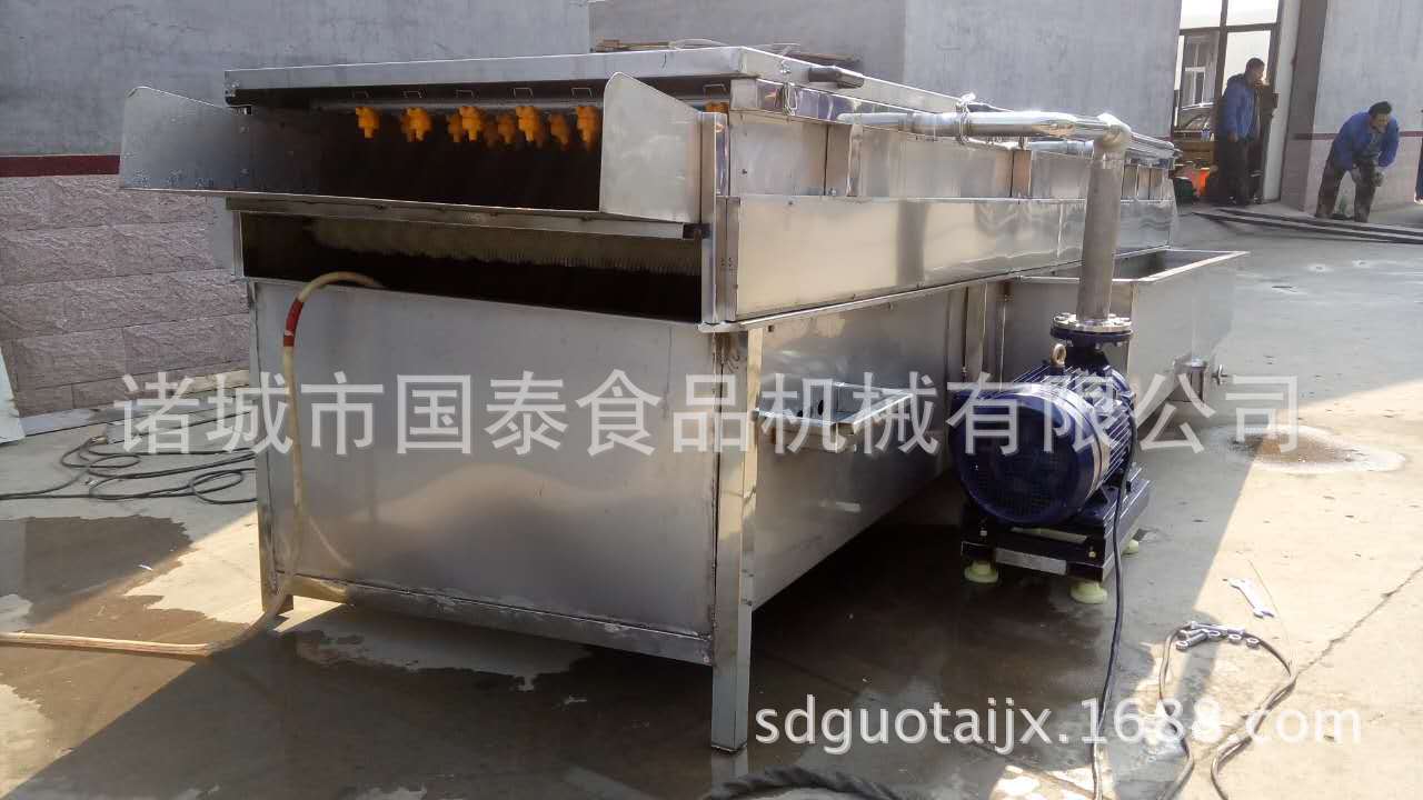 山药毛辊清洗去杂机采用SUS304不锈钢制做,设备上部有高压喷淋对果蔬表面进行冲洗可有效的洗去表面粘有的泥沙、中间有毛辊,通过毛辊的转动带动果蔬的前进,并对物料的表面进行刷洗可深层清洗果蔬表面粘连的不易冲洗的杂物,毛辊采用双层毛刷可以将表面的毛发和纤维物的清除。经毛辊清洗去杂机去除毛发及纤维杂物后,提高了果蔬的洁净率。下部可进行水收集使之能循环利用,节约了成本。