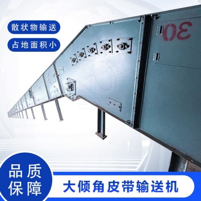 1、全封闭大倾角皮带输送机采用的是具有波状挡边和横隔板的输送带,并且输送带上设有密封罩。因此,特别适用于大倾角及垂直90°输送。