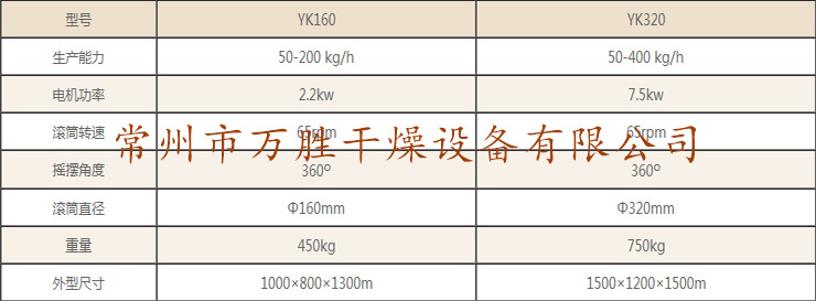 详细信息 订货号CZWSYK01 加工定制是 货号CZWSYK01 品牌万胜 型号YK-160型 适用物料多种可用 应用领域食品 化工 制药 传热面积0(m2) 转速24(r/min) 功率3(kw) 外形尺寸0.7*0.8*1.28(m) 重量280(kg)