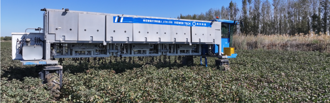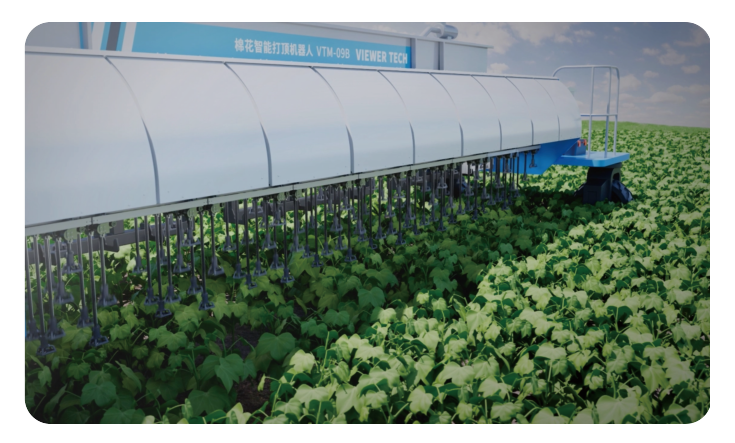 棉花智能打顶机器人VTM-09B专为棉花种植打顶场景下打造的农业机器人,配备传感器和机器视觉 系统,能够精准识别棉花顶芽,模仿人工打顶操作,实现高效、精准的作业。借助农艺大模型与实时环境 感知技术,动态调整打顶策略,即便在夜间也能持续作业,有效缓解了农忙期劳动力短缺的问题。