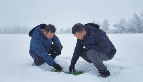 芳草湖农场农业发展服务中心工作人员扒开积雪查看麦苗。