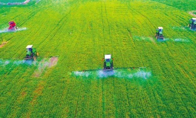 襄阳市襄州区黄集镇种粮大户程玉德用大型农机和无人植保机对6000亩小麦、油菜喷施叶面肥和植物生长调节剂。眼下,襄州区150多万亩冬小麦陆续进入返青拔节期,该区组织农技人员深入田间地头做好田管技术指导。