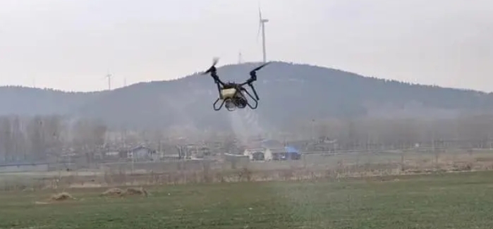 邹城市大束镇武家庄村的麦田上空有无人机进行植保作业