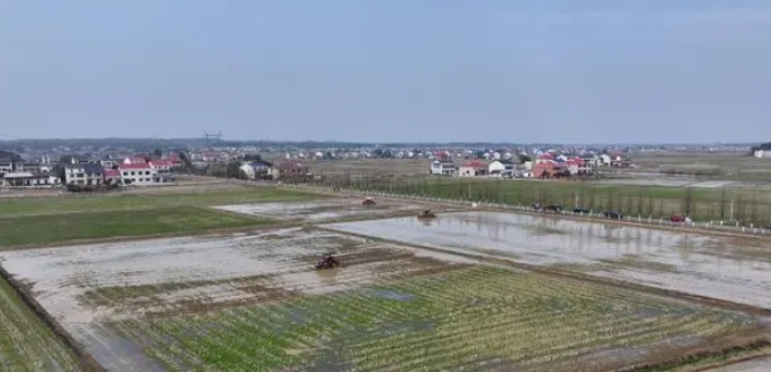 在罗江镇罗江村,千亩大田成方相连,四台旋耕机来回穿梭,正在进行第一轮打田。岳阳千度农业发展股份有限公司流转了罗江镇3000亩土地,计划在这里播种早稻。